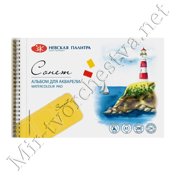 Альбом на спирали для акварели, А5, 200 г/м2, 24 л, 100% целлюлоза, среднее зерно, Сонет