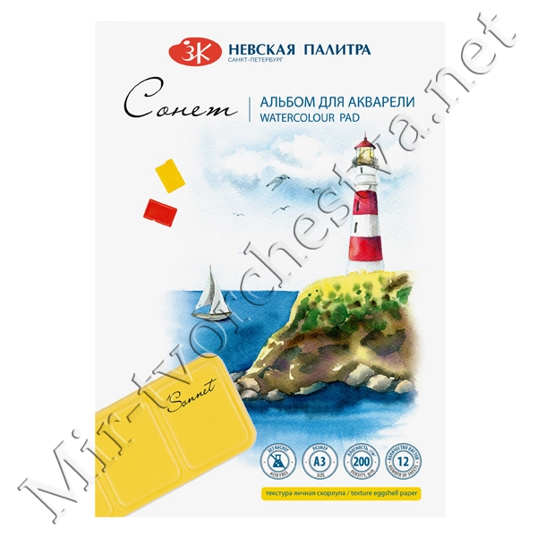 Альбом-склейка для акварели, 200 г/м2, А3, 12л, 100% целлюлоза, яичная скорлупа, (ru), Сонет