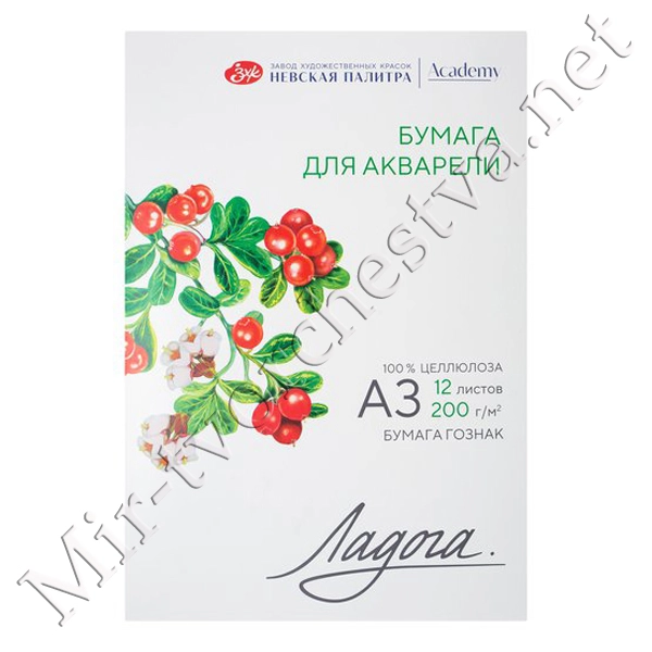 Папка для акварели, А3, 200г/м2, 12 листов, 100% целлюлоза, среднее зерно, Ладога