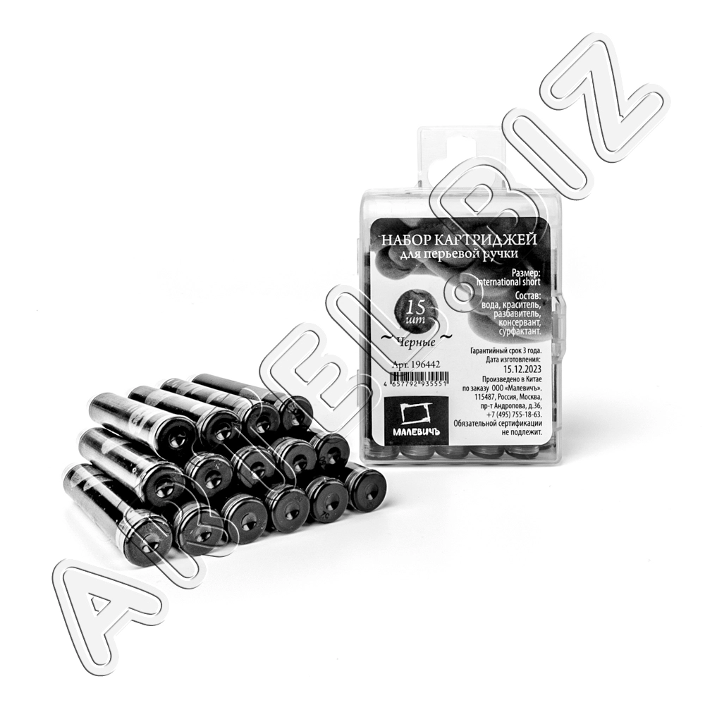 Набор картриджей для перьевой ручки, 15 шт, Чёрные, Малевичъ