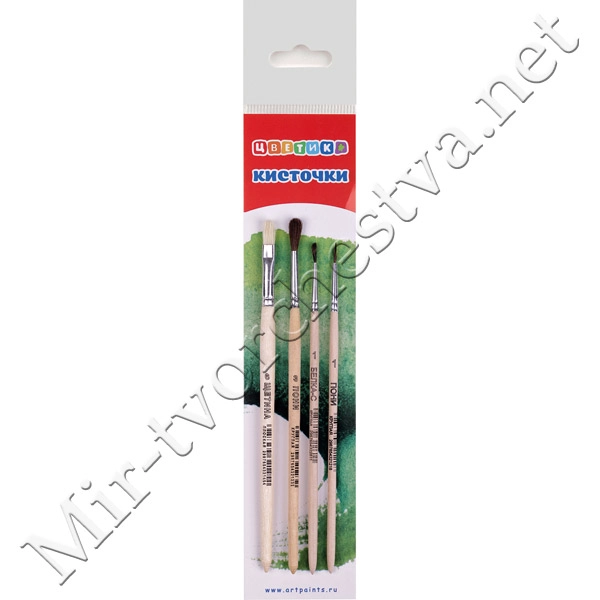 Набор кистей № 9 (4 шт): щетина плоская № 6, белка круглая № 1, пони круглая № 1, № 3, Цветик